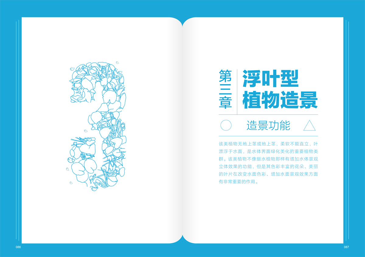 《水体植物景观》按照植物的特性和景观功能分类,分为挺水型植物造景、浮叶型植物造景、漂浮型植物造景、沉水型植物造景、岸边湿地植物造景、滨海湿地植物造景,方便园林从业人员在实际应用中参考借鉴。