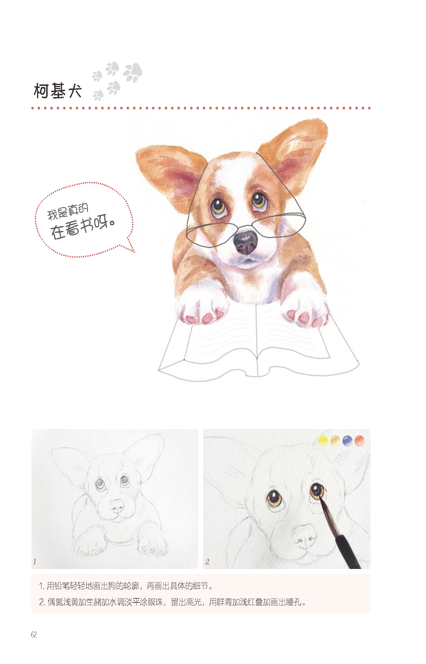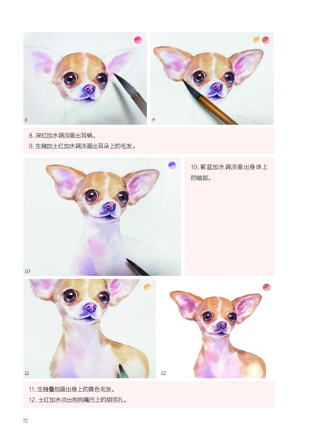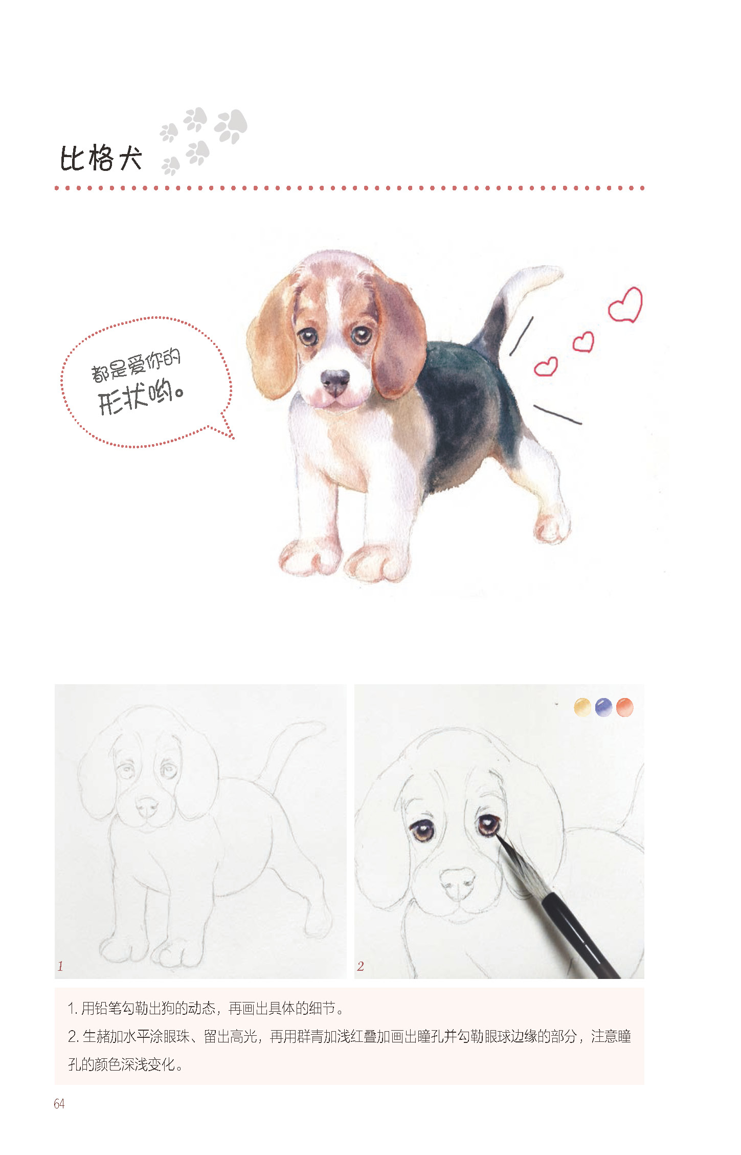 1.以萌宠作为切入点,展现了水彩画中对萌宠的颜色、布局、质感以及工具和基本技法的学习,图解直观,简单易懂。