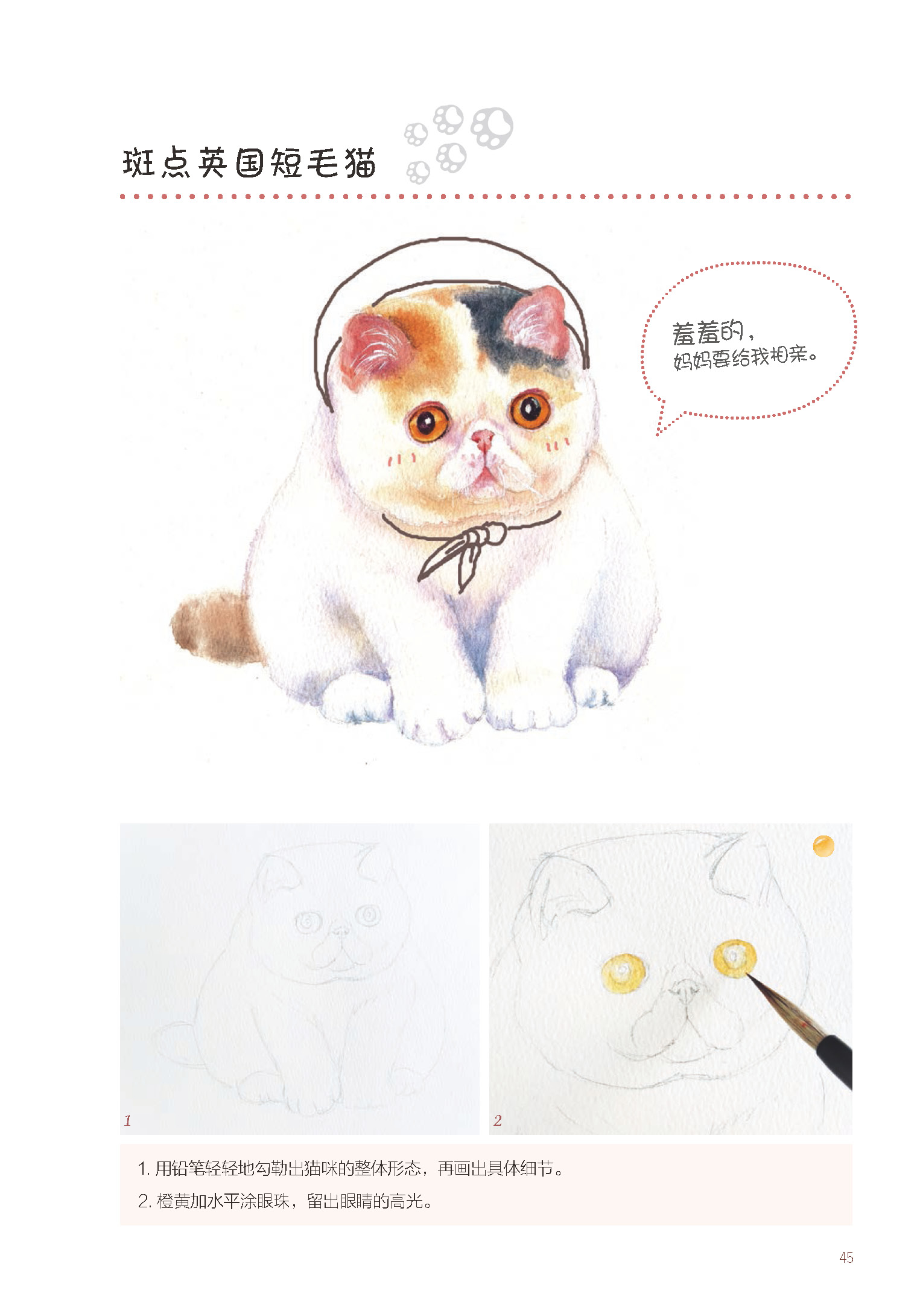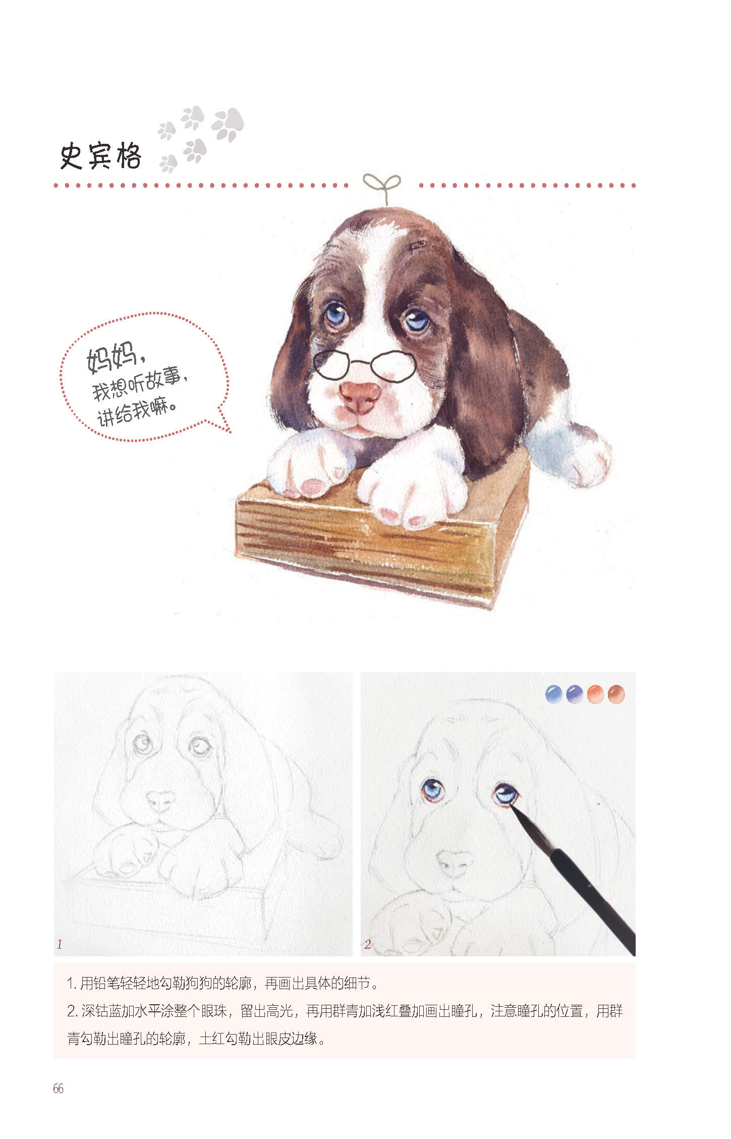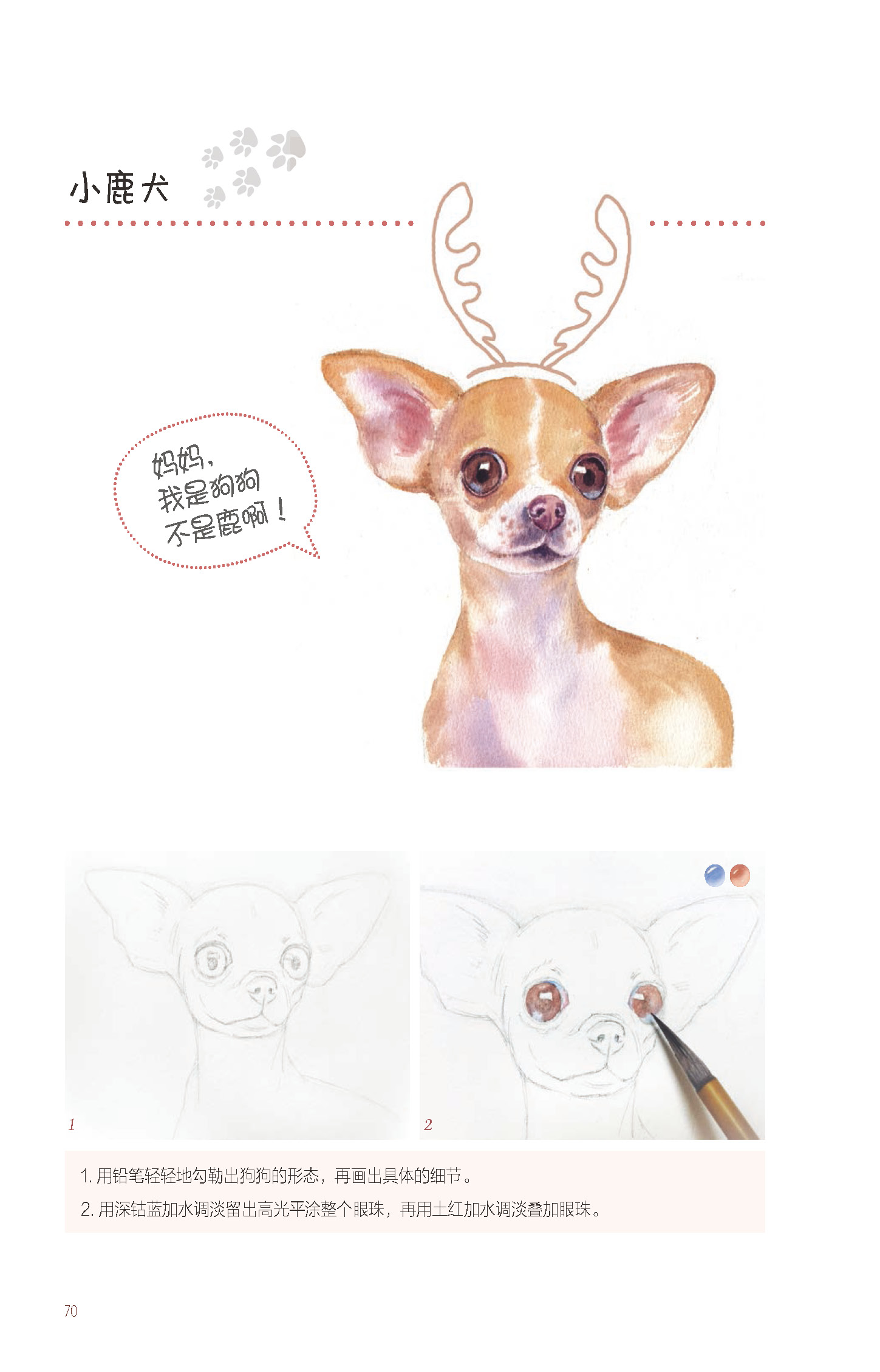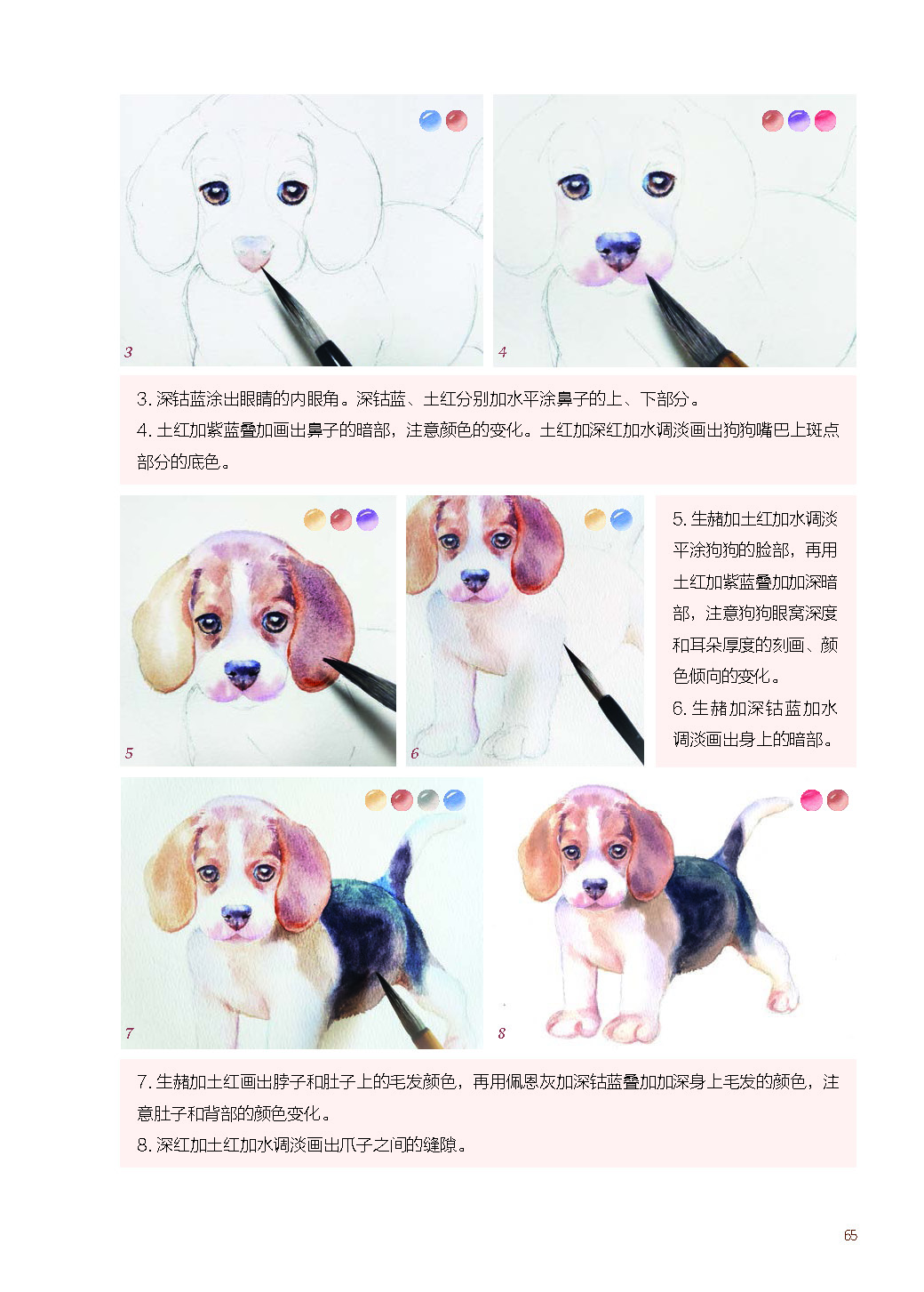 1.以萌宠作为切入点,展现了水彩画中对萌宠的颜色、布局、质感以及工具和基本技法的学习,图解直观,简单易懂。