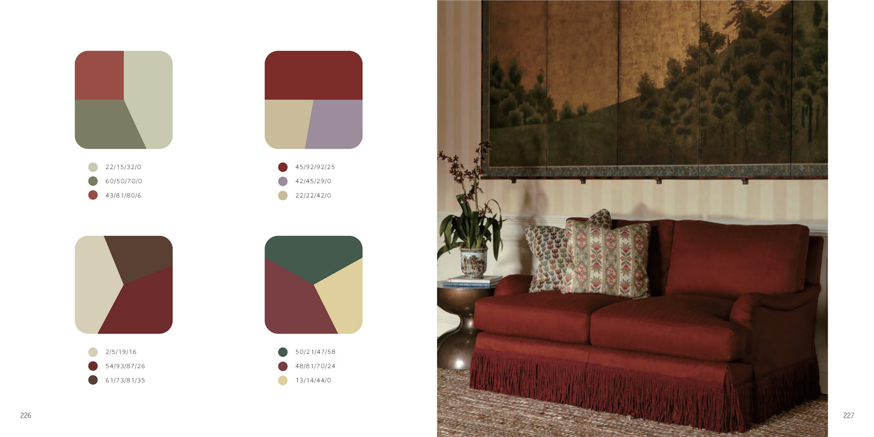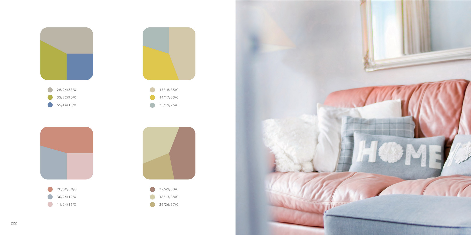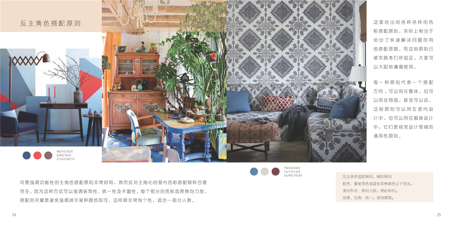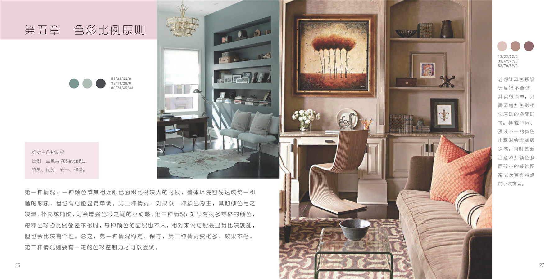 无论您是急于为客户做室内设计配色的设计师,还是想改变一下家居配色风格的普通读者,这本书都能为您提供令您满意的色彩搭配。不管您是喜欢时尚现代的风格,还是衷情于古典的风雅,抑或崇尚田园的自然,或许还有一点原木情结,甚至于您想让自己的居室有些禅意,都可以从书中找到相应的配色方案。CMYK的参数可以保证您准确定位色彩,配色比例可以让您一眼找到主角与配角。