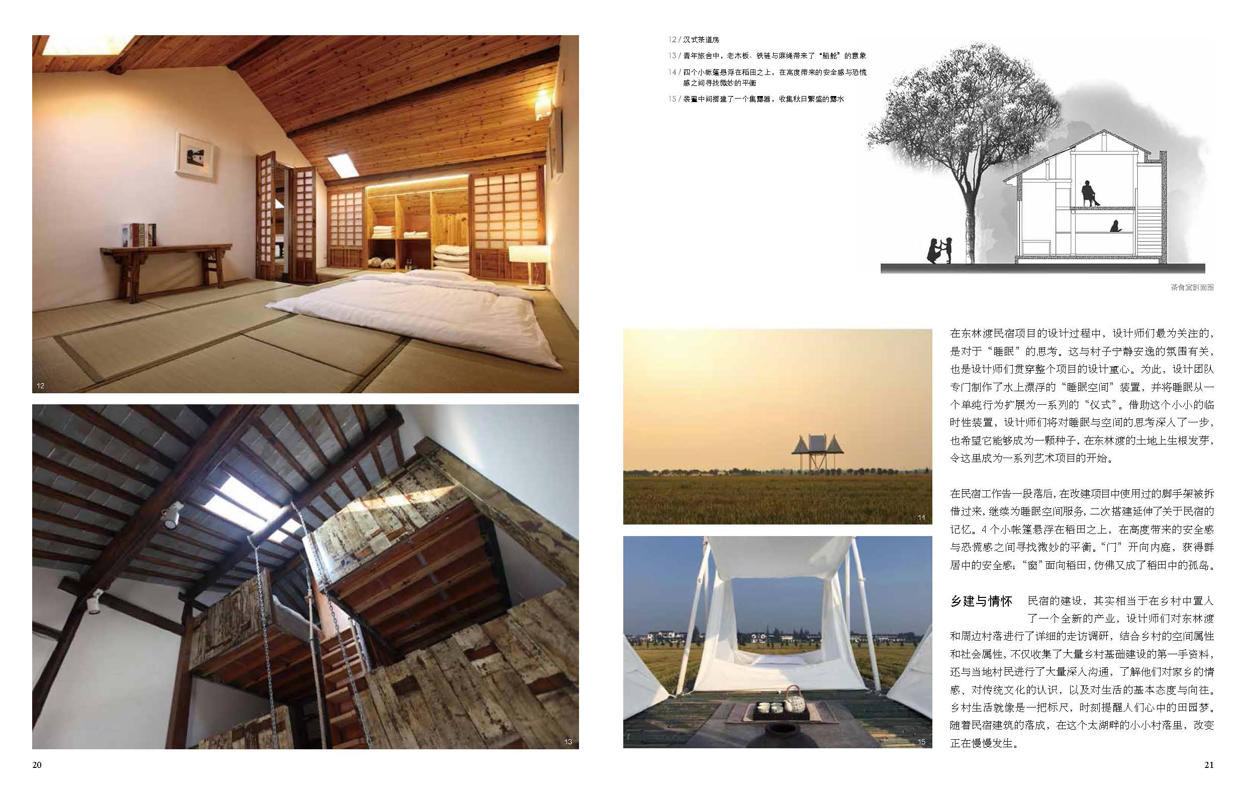 《乡村民宿》精选全球范围内38个案例,侧重解析建筑设计等技术性方面的内容。书中每一个案例既有实景图片和设计图纸的展示,也有详细的文字分析,为读者展现了乡村民宿的别样魅力。希望本书通过展示图片、设计图纸以及详细的文字解析,可以让读者更好地了解乡村、了解民宿,同时为民宿设计师及相关从业者提供参考。