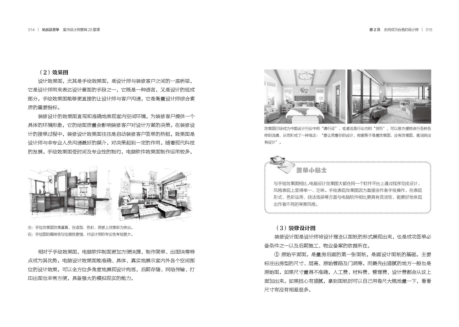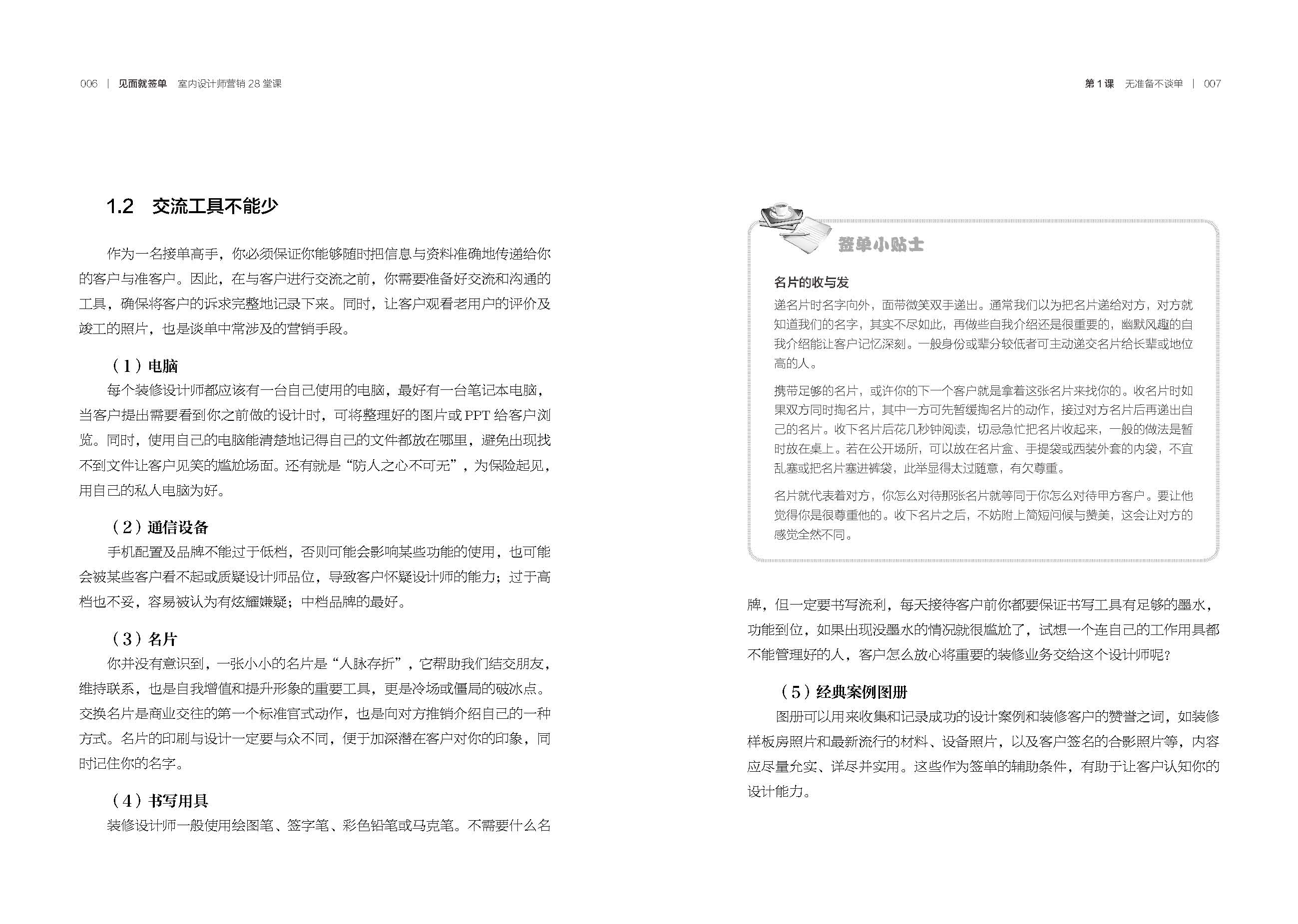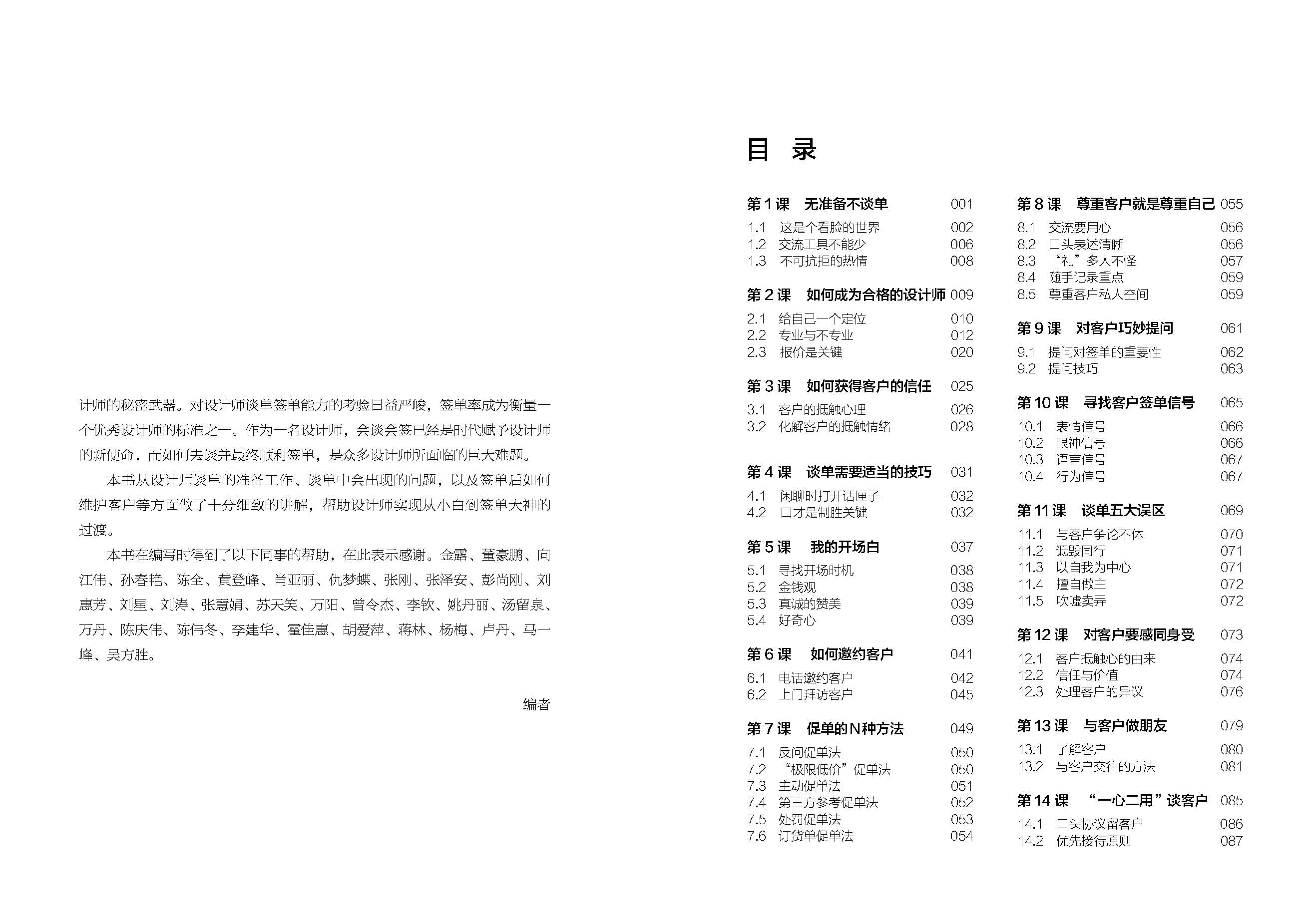 本书从设计师谈单的准备工作、谈单中会出现的问题,以及签单后如何维护客户等方面做了十分细致的讲解,帮助设计师完成从小白到签单大神的过渡。