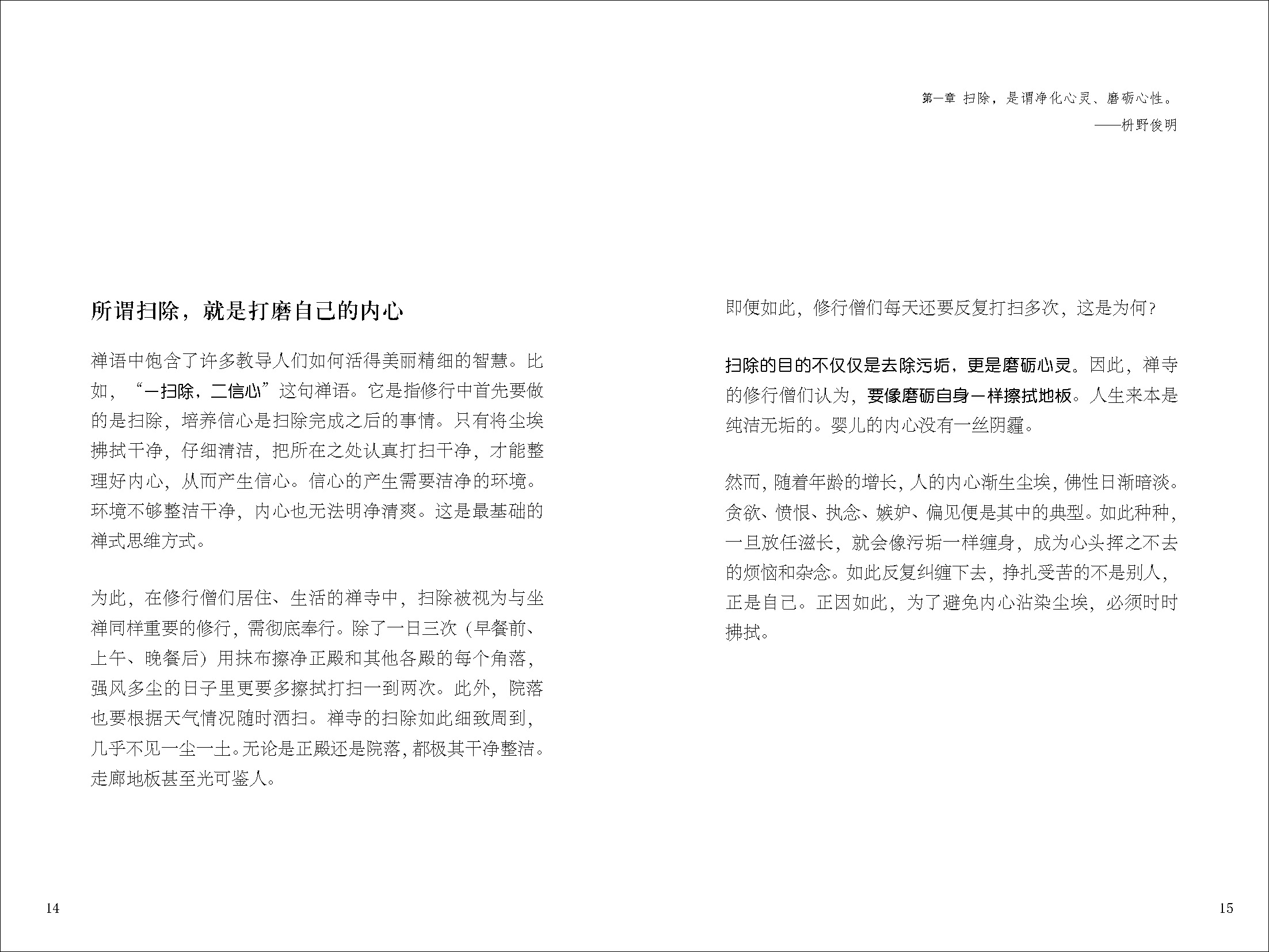 本书作者为日本禅学大师枡野俊明和扫除专家冲幸子,将禅学中扫除的智慧和欧洲极简整理术相结合,内容共分为三章:第一章,枡野俊明分享扫除与调和心灵的作用,即通过打扫外部环境来整理内心,去除不必要的执着和杂乱的心绪;第二章,冲幸子分享许多实用整理术及欧洲经验,她指出扫除困难的原因是物品太多,进而讲述舍弃物品的准则;第三章,枡野俊明与冲幸子对谈,融合东西双方关于扫除的观点与诀窍,意在使读者珍惜现有的一切,回归丰饶的初心,获得清爽简单的生活。