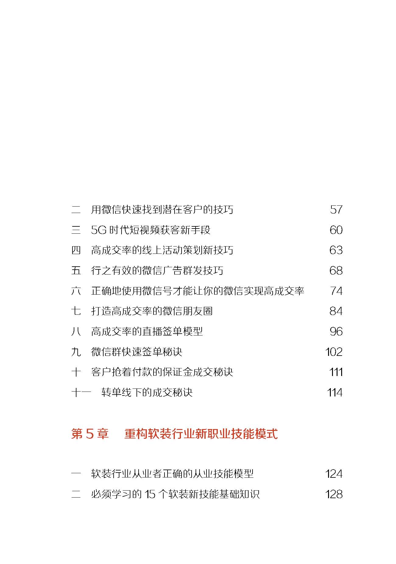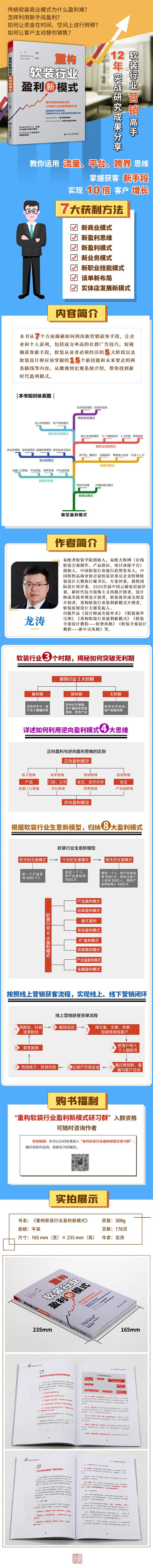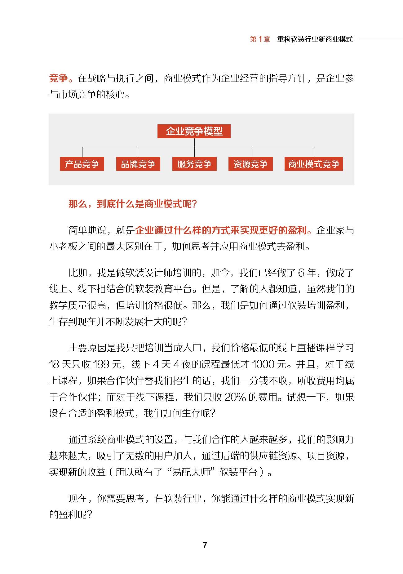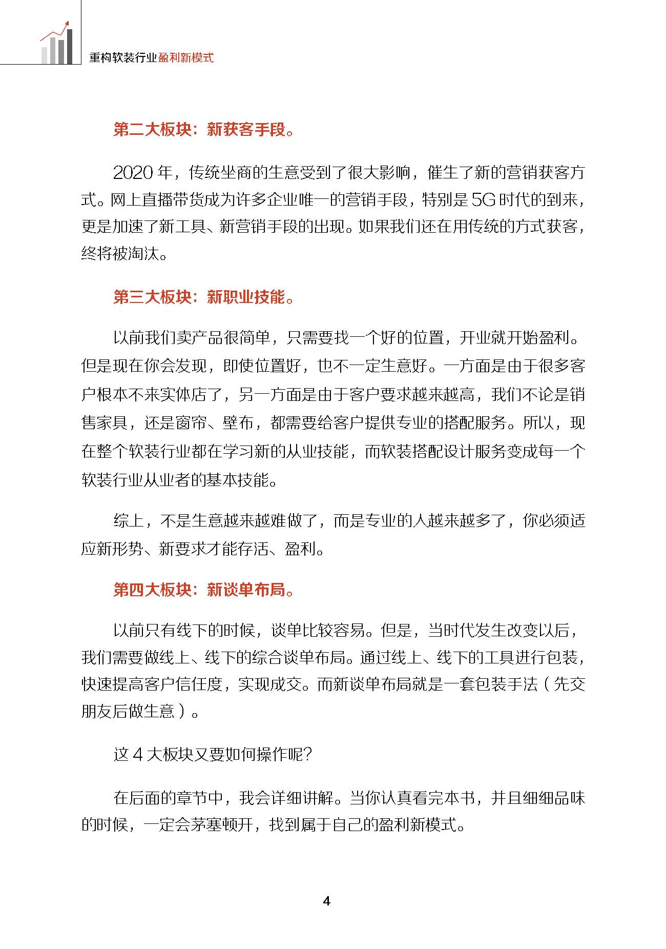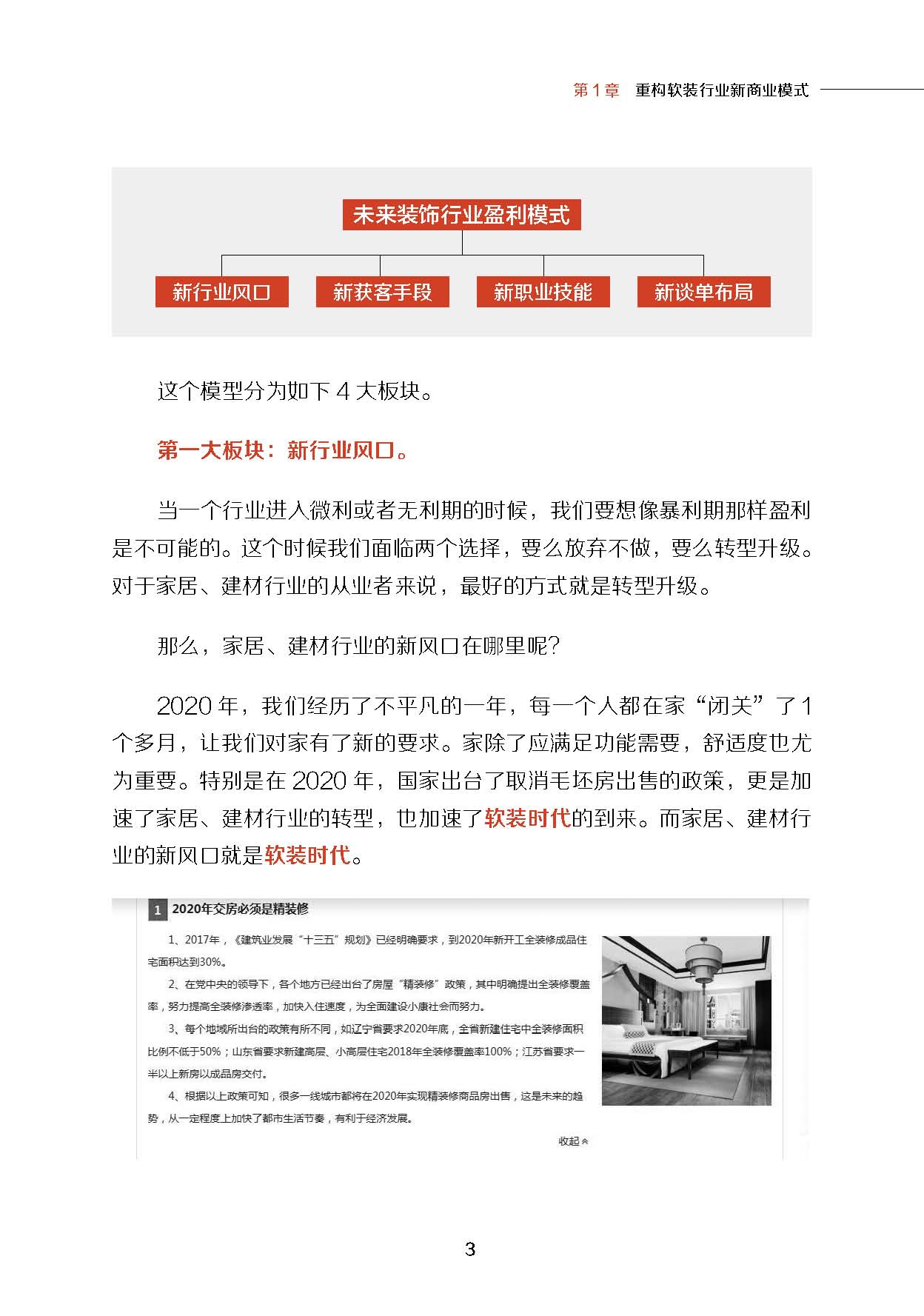 在书中,您将会看到传统软装行业商业模式为什么盈利难,新时代企业必须具备的流量、平台、跨界的思维,如何让资金再时间、空间上进行转移,如何让客户主动替您销售,高成交率的微信广告群发技巧,5G时代短视频获客新手段,软装从业者必须经历的5大阶段,以及软装设计师应该掌握的15个新技能和未来要走的两条路线。