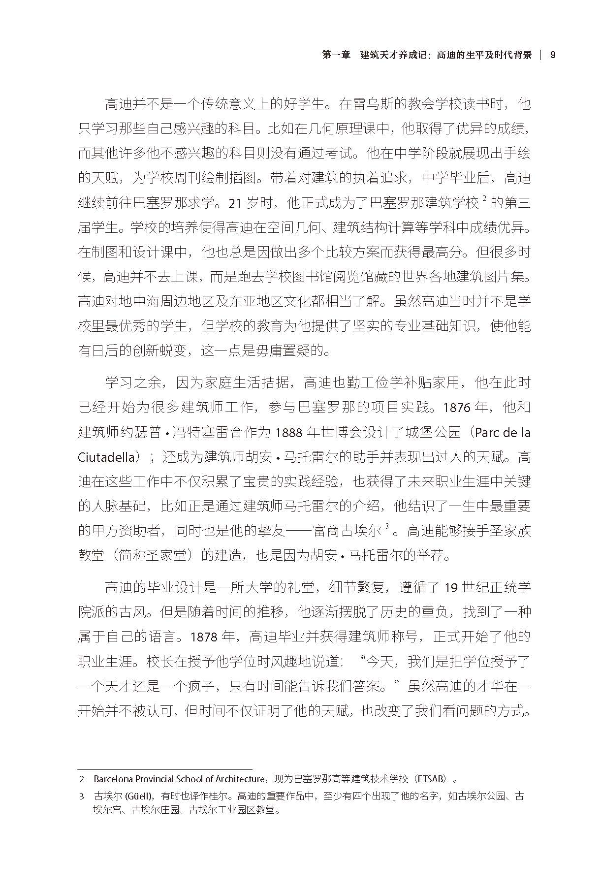 高迪的一生作而不述,仅仅留下只言片语,但他的思想却在其作品中时刻闪耀着智慧的光芒。国内现已出版的相关著作,大多是以画册的方式呈现高迪的作品,让我们很容易陷入美学式的推论,误认为高迪的作品仅仅是一场视觉上的盛宴。但其实在令人称奇的造型背后,高迪的建筑也有着缜密的设计逻辑和理性的结构思考。他在技术与艺术之间找到了一种精妙的平衡,成为一代建筑大师。高迪的成就和天才是难以复制的,但他的设计理念和方法是值得我们深思的。