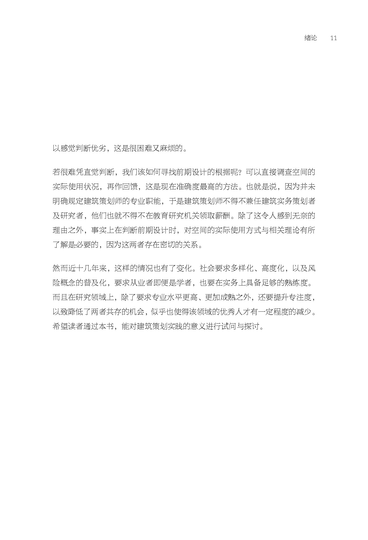 前期设计可说是日本现代建筑发展的重要内涵所在,展现了日本的现代建筑设计专业中非常重要的知识整合及方法,对于中国建筑学习和从业者而言,非常值得参考。本书深入浅出地为读者讲解了前期设计理论与设计实践的方法,相关理论不仅是学术研究的视点与方法,也可作为建筑设计的方法,其最终的目的是提升人们的生活质量。从作者的论述中,可以清楚地看到这个时代在空间场域、行为计划和文化知识之间,有了最传统和最激进的辩证和想象,他一面乐观地接受了现实功能和科学理性的系统逻辑;但另一方面也在行为、场所和经验上获得了更多可能。
