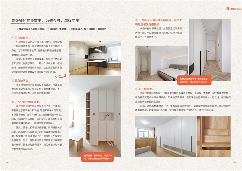 本书分为三部分,分别为基础篇、攻略篇和案例篇。基础篇共7章,着重讲解全屋定制的准备阶段,即全屋定制需要规避哪些坑、做好哪些工作,以及设计的要点等;攻略篇有5章,从卧室、客厅、厨房、书房等空间入手,分别讲解全屋定制中的各种空间应如何规划,以及与其他空间怎样协调统一,共同完成全屋定制的装修,实现全屋风格一致;案例篇精选了9个案例,针对不同户型或者一些特殊情况,解析全屋定制如何设计,以及可以借鉴的奇思妙想等。全书围绕全屋定制,从准备工作开始,到具体的设计与装修,再到案例解析,可谓是一本非常实用的全屋定制设计装修攻略手册。