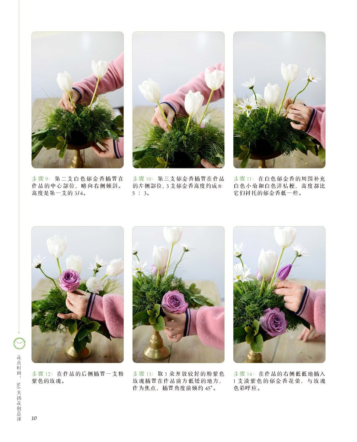 本书以街旁绿化植物、四季常见植物以及鲜花店常见鲜花甚至各色蔬菜等普通的花材物料为材料,制作具有艺术性和观赏性的插花作品,不仅适用于居家摆放,同时也适用于商业场所和文化场所。每个作品都对花材、容器、制作步骤有着详细的解读;并且本书整体内容编排按照应季的花卉、蔬菜、绿植等植物类型,选取每个时令和节日所适合的花材进行布置,既符合植物的时令特点,又迎合了该时令应有的节日气氛。所有案例操作简单,取材方便,容易上手,让读者用较少的时间和精力制作出高雅美丽的花艺作品。在介绍每个作品的制作步骤前,作者都会通过温暖的语言传达出符合时令的气氛语言以及制作的灵感来源,让读者循序渐进地了解花艺概念,喜欢上花艺制作。
