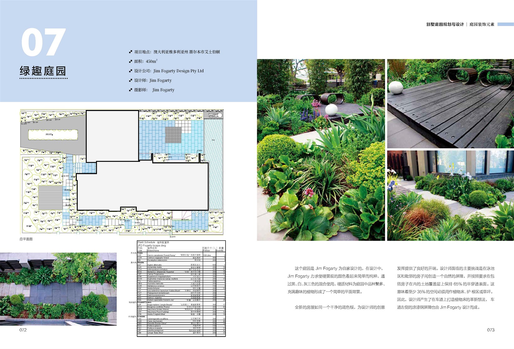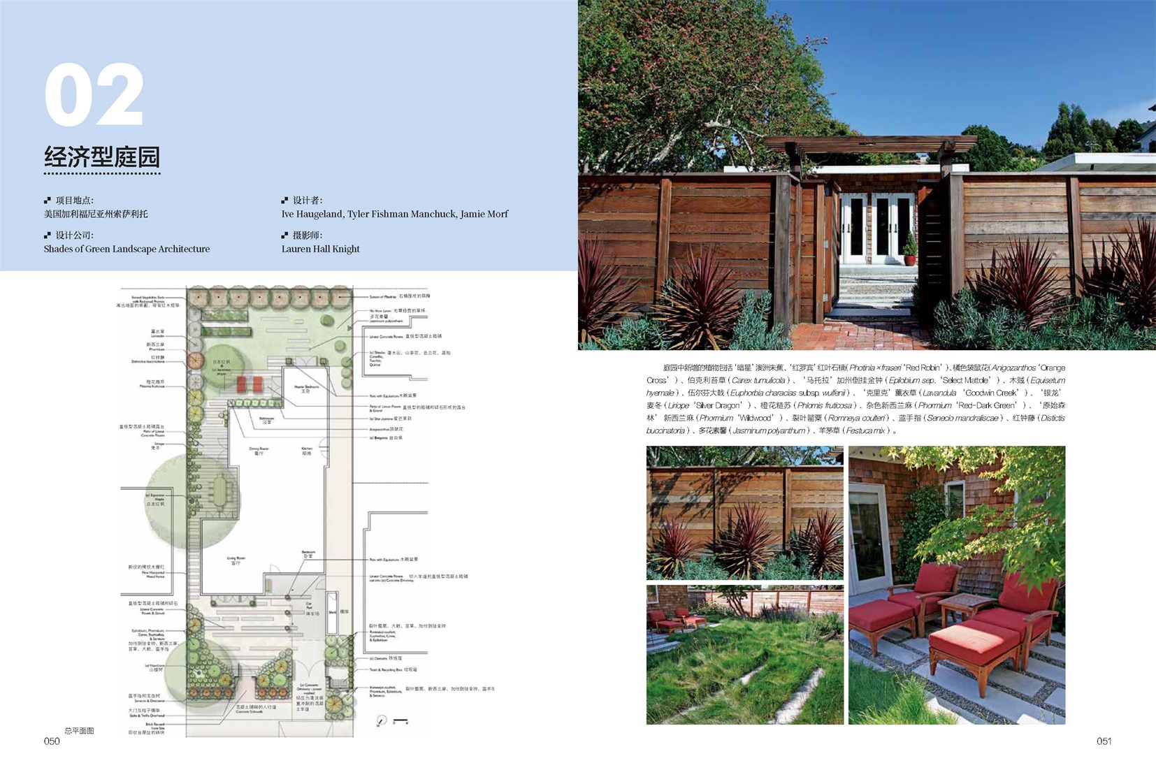 每个案例均配有平面图,有些还有素描图和三维手绘图,已经完成的景观部分,全部用图片来展示庭园全貌,包括一些细部节点,如植物、铺地、水景及雕塑等。