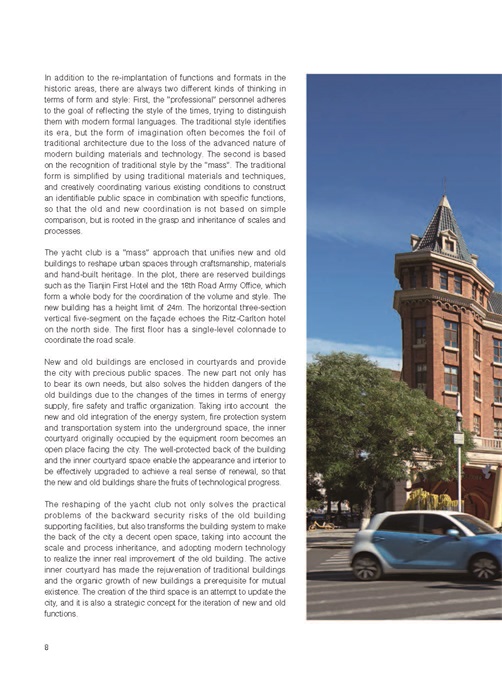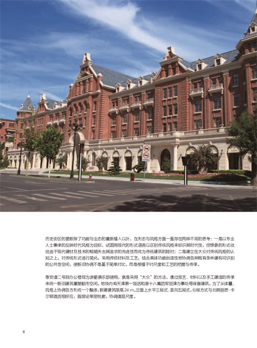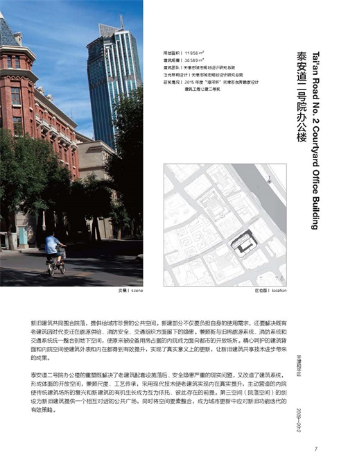 为方便读者阅读,本书将十个建筑作品按两类进行归纳叙述,前六个是继承传统风格的作品,如泰安道二号院办公楼、丽思·卡尔顿酒店(泰安道四号院)、天津职业大学、天津市民族文化宫、黑牛城道五福里、天津市第四中学迁址扩建工程;后四个是创造新空间、描绘现代城市生活的作品,如天津图书馆、滨海图书馆、滨海科技馆、济宁市群众艺术馆等。本书不仅是对过去十年工作的总结,更包含对未来建筑设计如何“继承和创新”的展望。