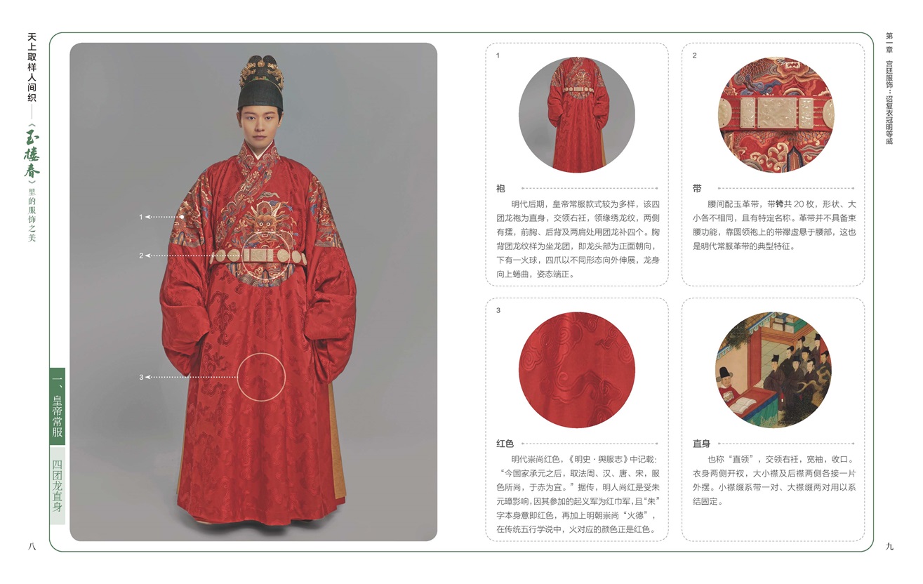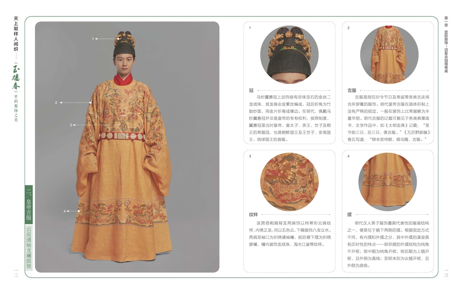 《天上取样人间织——<玉楼春>里的服饰之美》主要以热播影视剧《玉楼春》中的服饰为素材,梳理展示了包括剧中的近70种服装,以及各种不同款式的衣冠、饰品等。书中图片选取的定妆照服饰,包括皇帝常服、皇后礼服、士庶男子服饰、妇女便服、军戎服饰等,配以易读而不失专业的文字,详细解释不同服饰背后蕴含的文化。作者团队用简明易懂的语言,穿插我国古代服饰的基本知识,将多种服饰的特色和典故娓娓道来,同时介绍了刺绣、缂丝等“非遗”传统手艺。书中选取图片精美,文字优美,抒发了作者团队对中国服饰文化的礼赞。