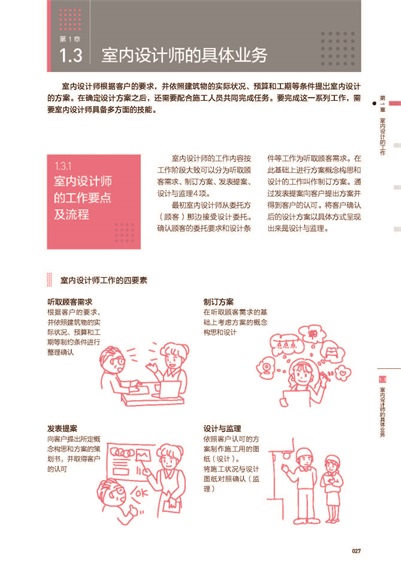本书涵盖了室内设计行业分类、家具组合、照明设计到人体工程学尺寸等多项内容,还介绍了可能会遇到的合作对象、工作内容、执行业务的流程,让设计师在面对业主时能实时判断与回复。