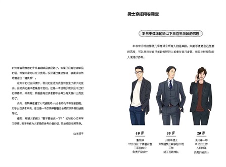 本书由日本人气造型师结合问卷调查结果编写,调查并总结出在女性眼中什么样穿搭的男性更有吸引力,什么样的穿搭给人印象不好,自己更关注男友或丈夫衣着的哪些细节等。是一本一看就懂的男士穿搭基础原理图解。全书共分为三章节,第一章介绍了十件每位男士都一定要有的单品,比如黑色西装外套、白色T恤、小白鞋等,告诉男性读者如何更快速的搭配好这十件基础品。第二章分为三个小节,分别为休闲穿搭、工作穿搭、服装配色,内容更加实用。第三章内容为应对各季节特定活动场合的穿搭推荐,比如春季赏花踏青的穿搭推荐、夏季和伴侣出行的穿搭、秋季公司秋招的商务穿搭、冬季春节回家的穿搭等。