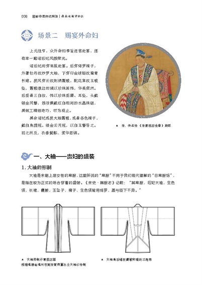 本书以宋代绢本画为主要蓝本,以宋代壁画为辅,搭建了33个场景,大到谒庙朝会、宫宴雅集,小到燕居侍花、耕织斗茶。尝试在特定情境的代入中,阐述命妇仕女、士宦富贾、少年儿童以及庶民百工不同群体的妆束,既涵盖巾帽冠带、衫袍鞋服,又包括发型妆容、纹样配饰。此外,结合汉服在当代生活中的应用需求,搭建了5个虚拟场景。通过古籍文献的考证,呈现宋代冠礼、及笄礼、婚礼的流程以及所穿服饰、所用配饰。