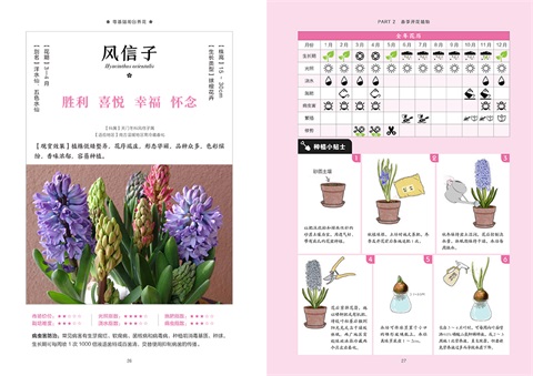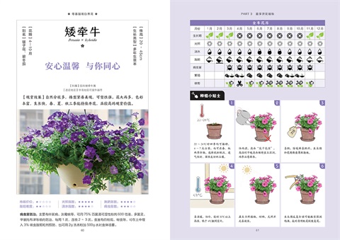 本书收录有适合春、夏、秋、冬四季栽培的近70种常见阳台花卉,按植物的开花季节归类,每种花卉除标有生长类型、花语寓意、观赏效果和观赏期等基本信息之外,还特别配备有全年养护花历,用图标的形式展现,简洁明了,同时又以漫画形式加入种植小贴士,阅读轻松,一目了然。
