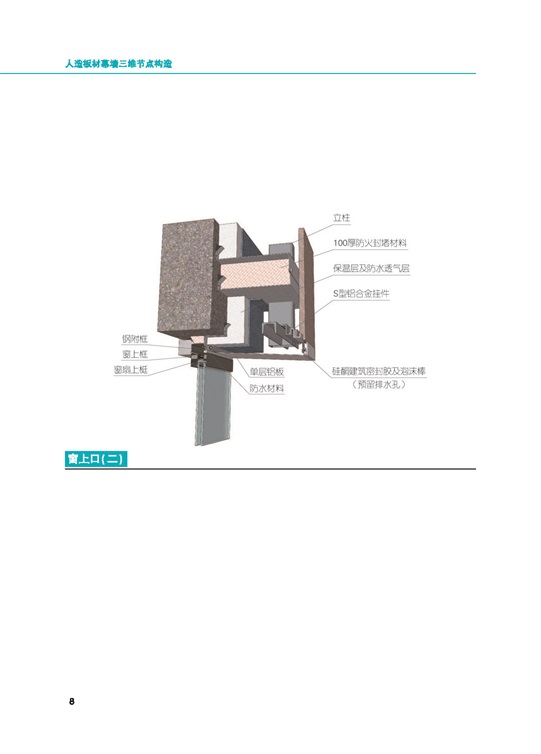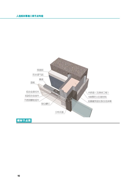 严格依照国家建筑标准设计图集《人造板材幕墙》(13J103—7)绘制相关节点的三维立体图,并在图上标记材质、文字说明等。