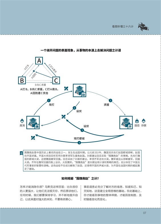 《三十六计》,或称《三十六策》,是一部兵法奇书,语源于南北朝,成书于明清。记载了三十六条兵法计谋。本书是基于《三十六计》原著上,进行视觉语言翻译给读者,辅助读者延长记忆的时间,便于读者去理解。书中每个章节主要包含:原文、译文、启示、总结、思维模型和规避之道这几个部分组成,将艰涩的古代语言简洁化、可视化,易懂、易记、易用。以精简清晰的视觉解读,来提炼核心思想,有助于读者快速入门,从而启迪智慧,提升认知。