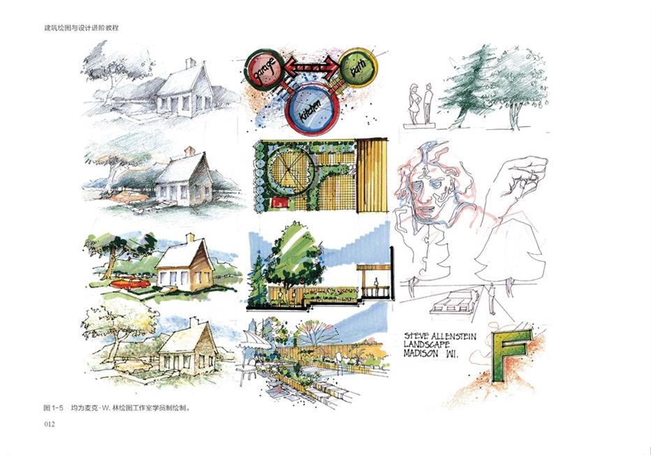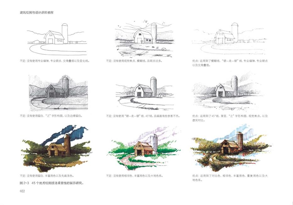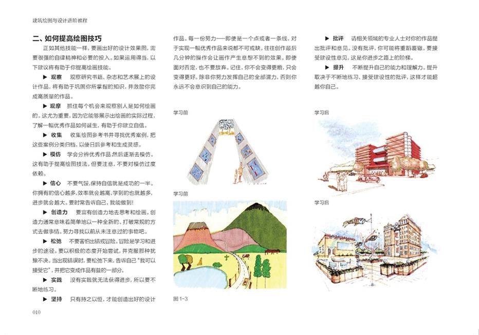 1. 本书用9个章节从不同角度讲解了建筑绘图的基础技法教学,深入剖析建筑绘图如何成为设计思考的核心工具,引导读者理解线条、光影、色彩等元素如何服务于空间构思、功能推敲与概念表达,实现手绘思考的进阶能力。