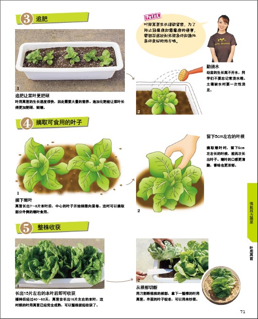 28种蔬菜的阳台栽种方法,播种、浇水、打叉、收获每一步都有实景照片,每种蔬菜配备栽种小月历和护理小贴士,可操作性极强。