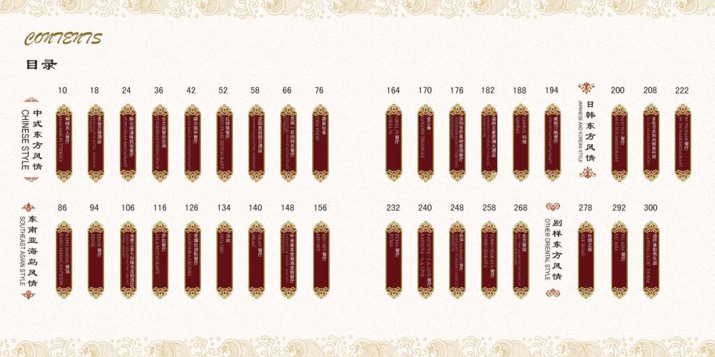 1.将东方风情分成四种类别:中式东方风情、东南亚海岛风情、日韩东方风情、别样东方风情