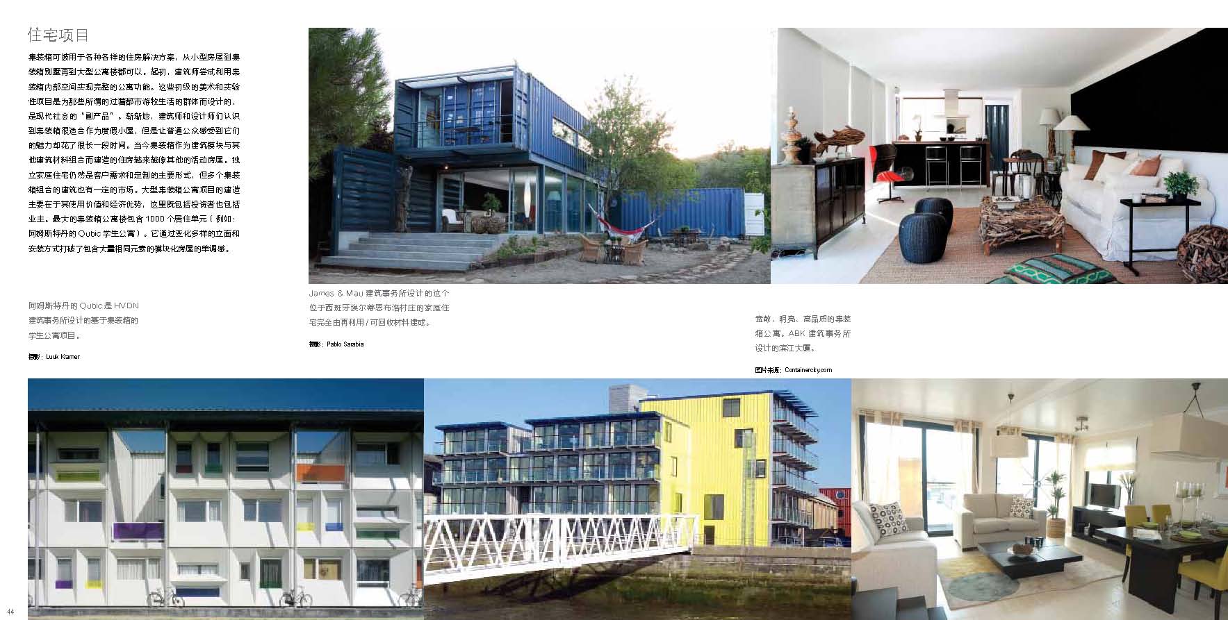 • 集装箱建筑适合城市发展需求,其安装简便,可以模块化生产,绿色环保,省时省力,非常灵活多变,相对传统住房能提供给住家更多的选择,一个钢铁盒子做成的房子充满时尚气息。该种建筑形式符合现代化城市新型住宅的走势,是在倡导适合现代社会需要的绿色消费。它将为创新城市建设的发展需求,绿色生活房屋的推广,以及在现代建筑环保节能方面,具有很强的示范作用和经济拉动作用。