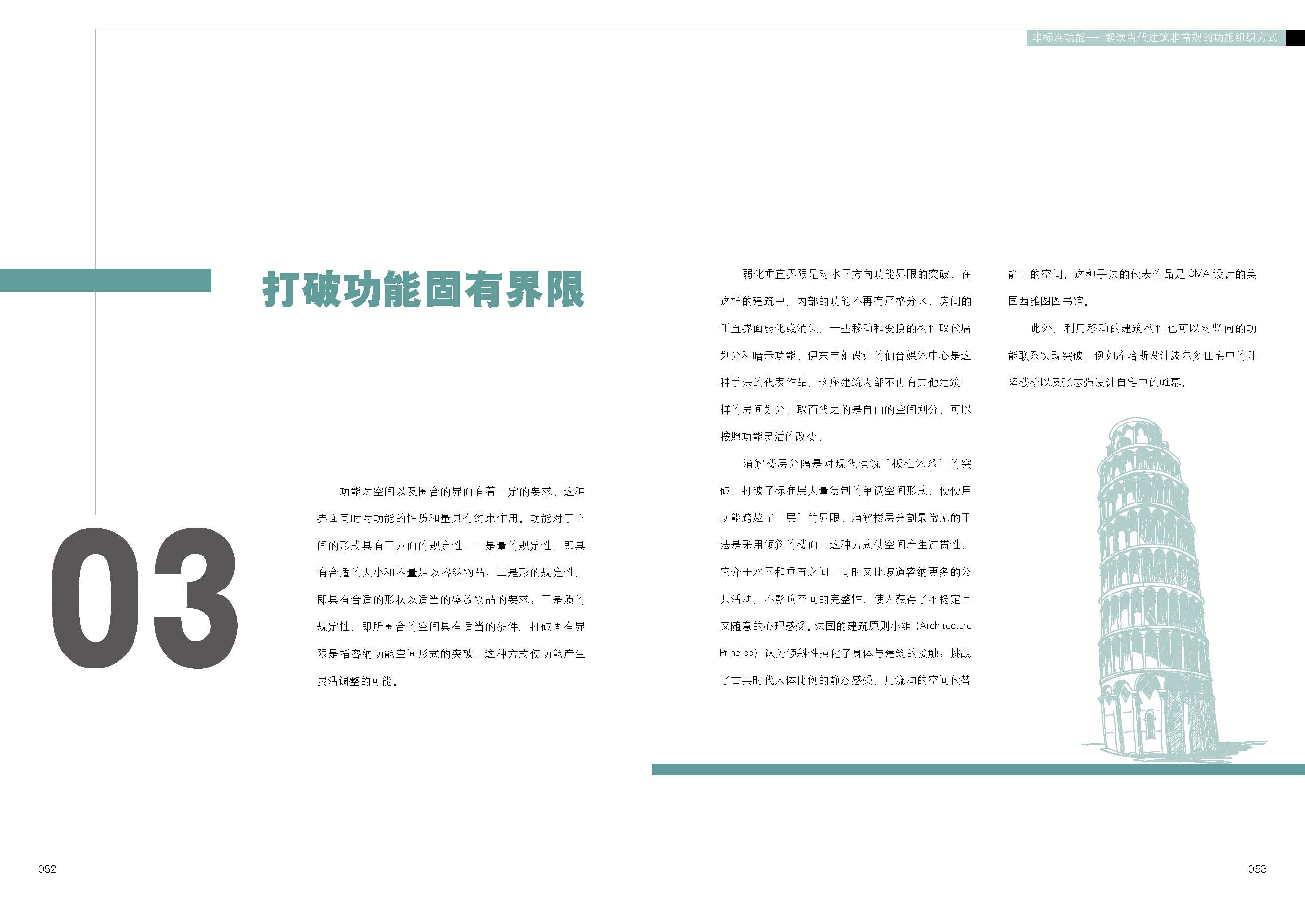 本书以功能组织相关领域的研究为基础,通过对当代功能组织方式创新的案例进行分析,用对比的方法揭示了这些功能组织方式的“非常规”的特征,归纳和提炼出非常规功能组织的一些基本手段,它们分别是:调整功能的空间格局、异化功能的流线模式、打破功能的固有界限、重构功能的层级关系以及强调功能的多元复合。本文进一步提出了这些非常规功能组织方式的适用领域以及现实意义,为我们审视当今建筑创作的创新机制和预测未来建筑功能组织的发展趋势做了铺垫。