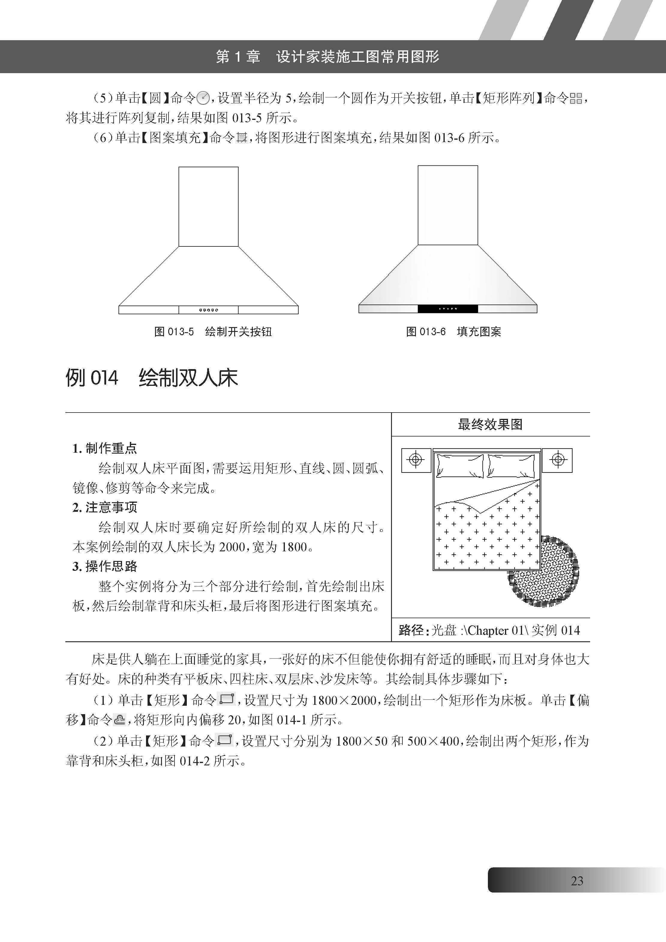 本书以建筑和室内设计制图为主,精心挑选了近200个案例进行讲解。全书共15章,主要内容有:设计家装施工图常用图形、绘制工装施工图常用图形、设计施工图常用材料图形、设计园林施工图常用图形、设计现代风格小户型图、设计简欧风格两居室图、设计现代风格三居室图、设计错层户型图、设计中式别墅图、办公空间设计方案、酒店客房设计、KTV包厢设计、餐厅设计、服装专卖店设计、绘制家具三维模型等。