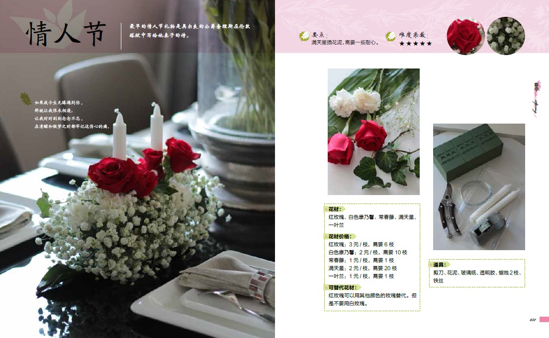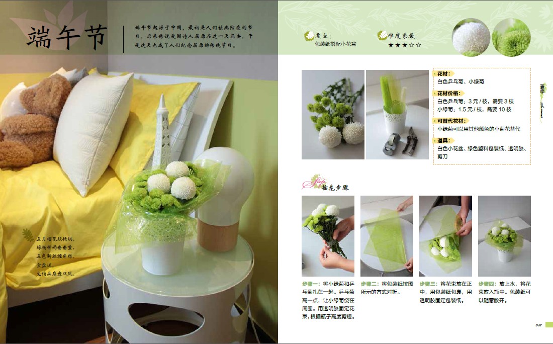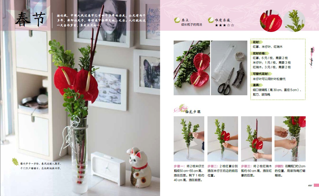 本书以时间为轴线,一年对应不同的季节和节日,每个新创意都能让读者萌生插花的念头,常见的花材和简单的操作让读者容易上手。分为节日花艺和日常插花。每个插花都配有详细的步骤讲解和图片。节日花艺会根据不同的季节选择当季花材,搭配节日的氛围,更好地烘托节日气氛。日常插花以简单装饰为主,应用形式多样,包括插花、浮花、手花等形式。
